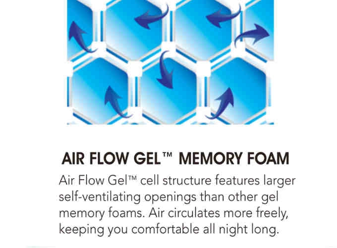 Drift off to a long, peaceful night’s sleep with the RespondaFlex 10″ Air Flow Gel Memory Foam Bed. Designed to be cool and comfortable all night long, this 10″ RespondaFlex Bed is made with 2″ Cooling Air Flow Gel Memory Foam, which contains larger self-ventilating openings throughout the cell structure, allowing air to circulate more freely than with other gel foams. This pressure sensitive foam molds to your individual shape to provide gentle contouring support, while refreshing air flow keeps you cool and comfortable all-night long. The Cool Air Flow Gel™ Memory Foam is paired with 2″ of Engineered Latex Foam, to provide high resilience comfort and additional contouring support. These two layers of lush, cool comfort are supported by a 6″ Reflexa Foam Base whose high-density foam provides long lasting durability and support that you can feel, giving you a great night’s sleep, every time.