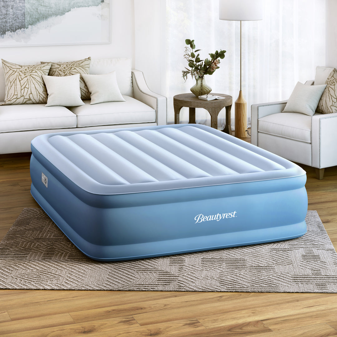 Sleep comfortably night after night on the Beautyrest Sensa-Rest Raised Air Bed. This raised air mattress has built in edge support and a careful attention to detail that provides the same comfort and support of a traditional everynight mattress. Vertical beam construction prevents the bed from rocking or swaying while getting in or out of the bed. Durable and built to last, the sturdy, heavy-duty vinyl locks in air for all night comfort. A Sure-Lock™ inset pump lets you dial in your firmness and maintains the pressure with its spring-loaded locking system.