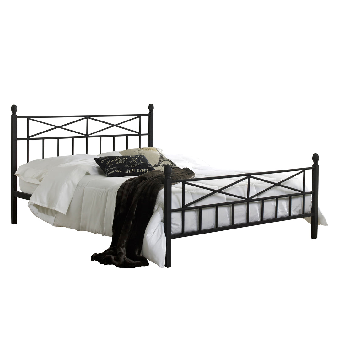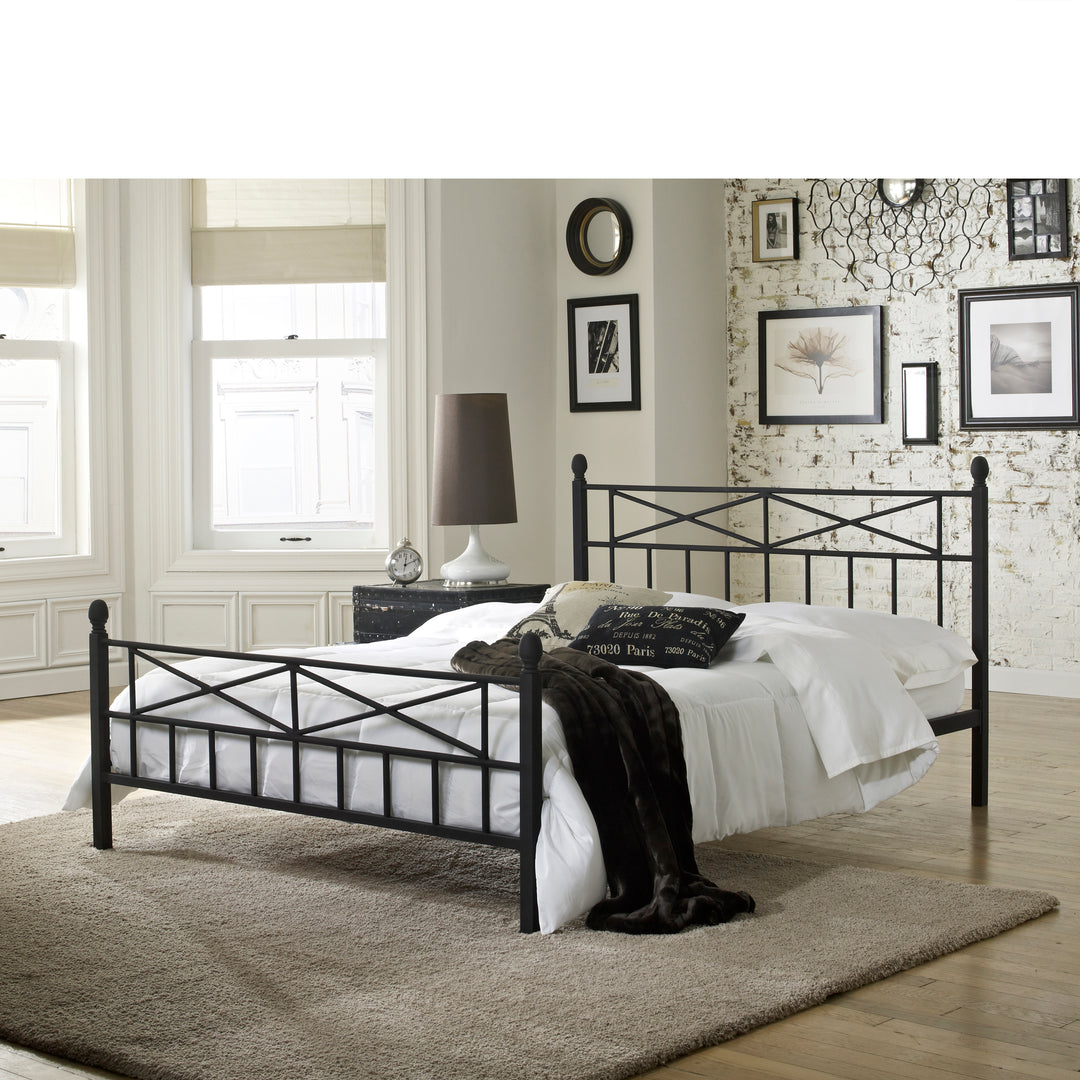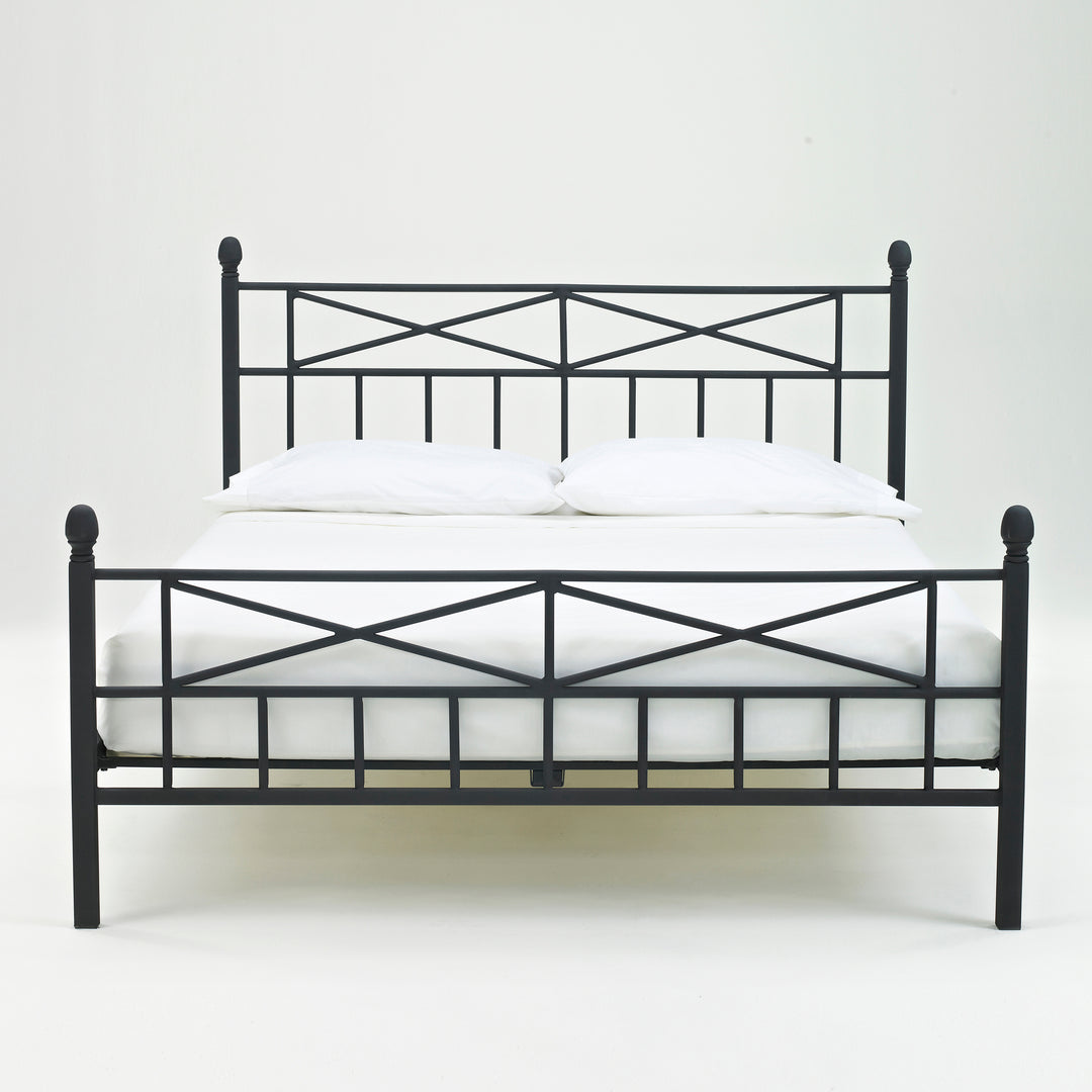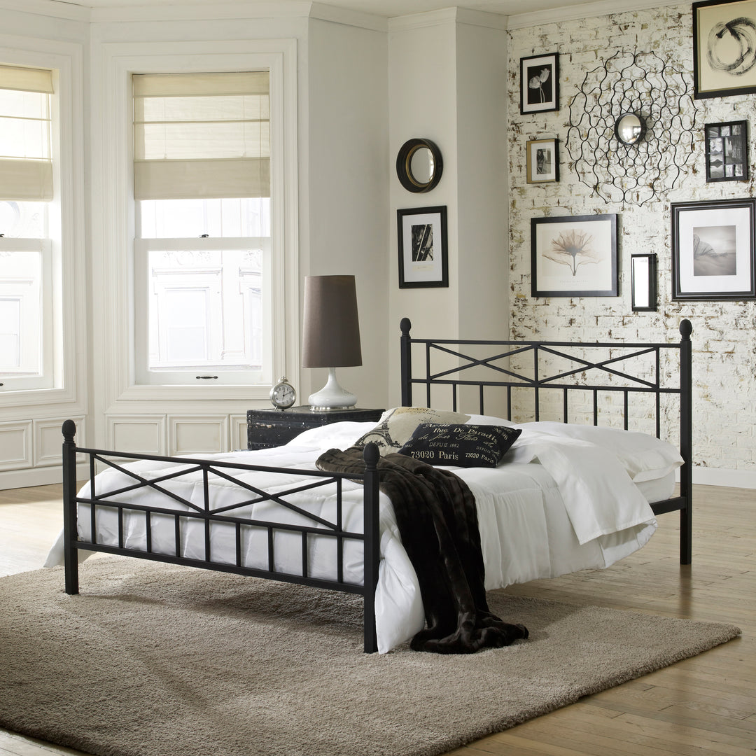 The Emma Metal Platform Bed features a unique black textured finish and stylish design. The criss-cross black metal design adds style to a simple, contemporary look. The Emma Platform Bed eliminates the need for a box spring and bed frame. The headboard and footboard are welded support up to 700 pounds.