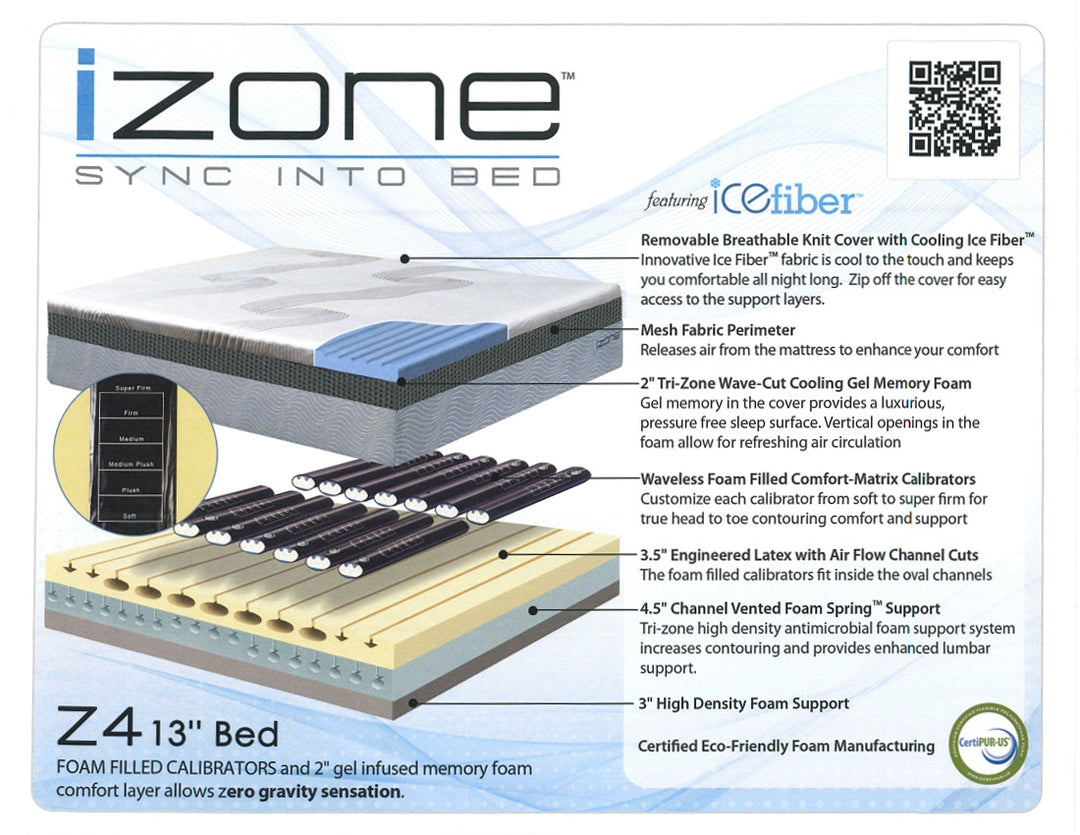 The Z4 mattress height is 13″ and offers cooling, adjustable comfort and support in seven zones from head to toe on each side of the mattress.