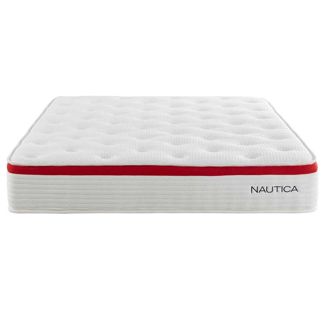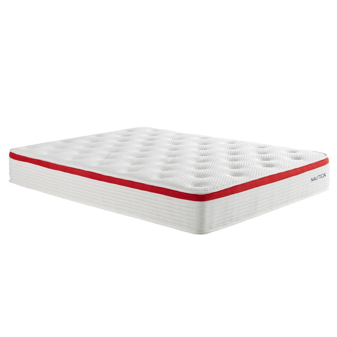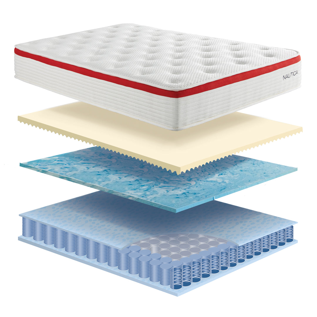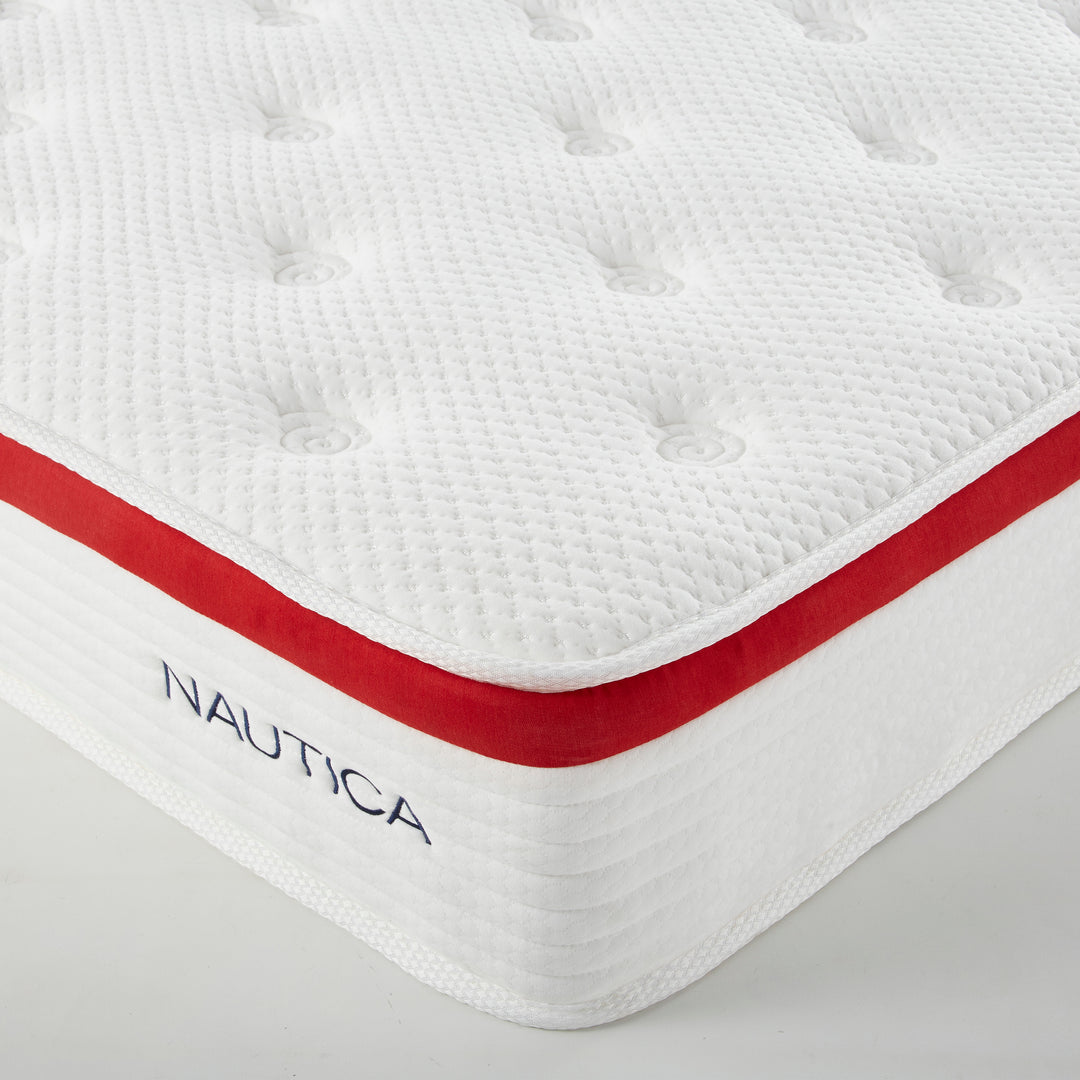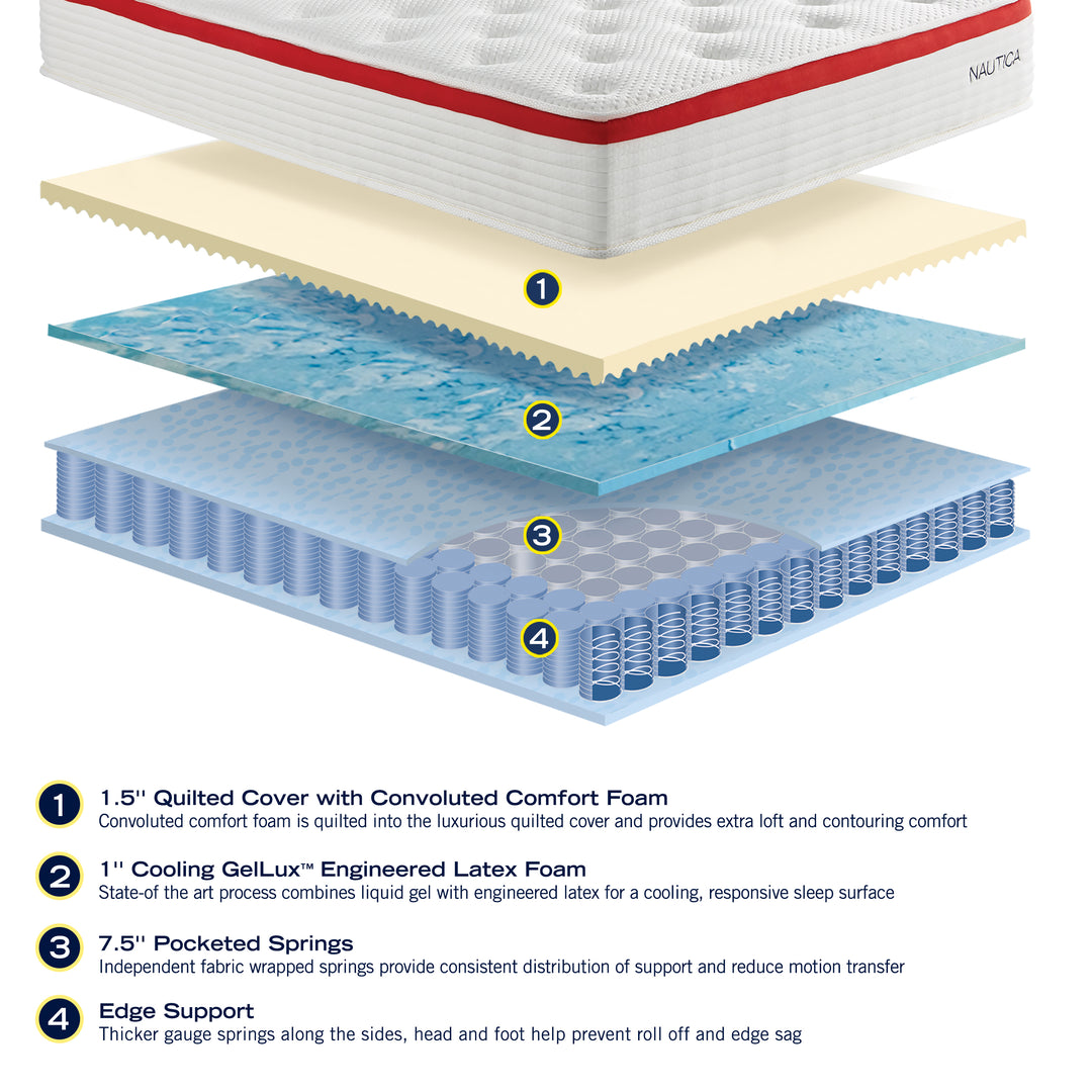 Soft, serene and beautifully designed, the Nautica Home lineup of cooling hybrid innerspring mattresses are crafted with the utmost care, passion and attention to detail. Nautica Home Hybrid mattresses rest atop a highly supportive, multi-zone foundation of independently fabric wrapped coil springs, gently flexing and yielding to your body and sleep style. These pocketed springs provide responsive pressure-relief and optimal spinal alignment all while reducing the overall motion transfer between you and your partner. Inspired by Nautica’s coastal heritage and love for the outdoor lifestyle, you can sleep Cool, Calm and Comfortable the Nautica way with the dynamic cooling power of GelLux Engineered Latex Foam. Soothing liquid gel infused with high-performance latex engineered foam offers the responsiveness of latex with the calming and contouring yet elegant feel of cooling liquid gel. Soft, sophisticated and exceptionally cozy, the cover uses a quilted pattern with plush convoluted comfort foam to provide additional loft and support.