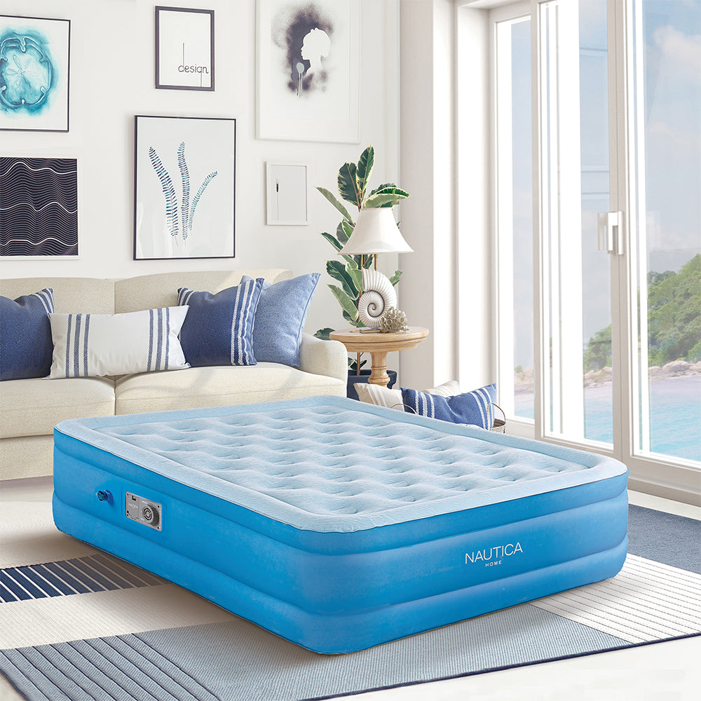 The Nautica Home Cool Comfort™ raised pillowtop inflatable air bed keeps you cool and comfortable all night long. This mattress is ideal for use as a guest mattress, guest bed or any other temporary sleep solution for a no compromise, great night of sleep for you or your guests. The air mattress provides maximum pressure relief, like a traditional every night mattress, with the offset coil-in-coil design that alleviates strain and reduces pressure on your body. Designed with a state-of-the-art Sure-Lock built-in pump, you or your guests can sleep soundly with a higher firmness level and proven all night support while also helping to prevent air from leaking while you sleep. A powerfully cooling pillowtop combined with premium puncture-resistant Duratex™ vinyl, provides soothing comfort that is made to last. Each Cool Comfort air mattress is treated with a unique Sleep Fresh antimicrobial solution to prevent the spread of bacteria or odors. The Nautica Home Cool Comfort air mattress fits neatly and easily into a sturdy nylon carrying bag for travel or convenient storage.