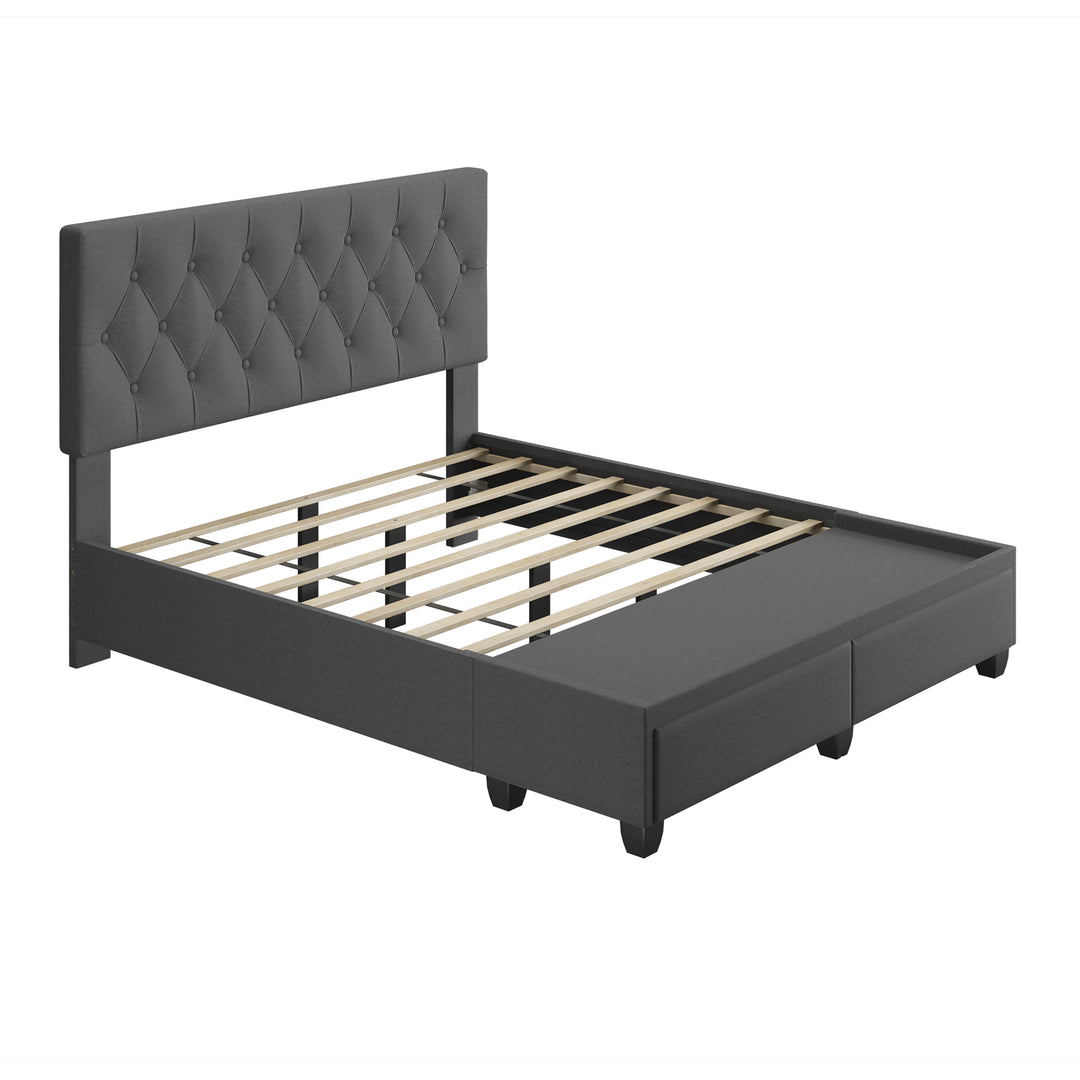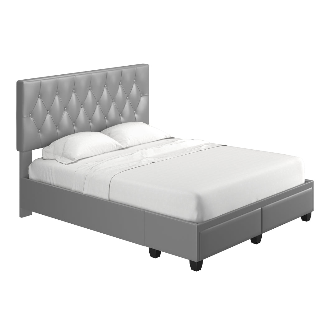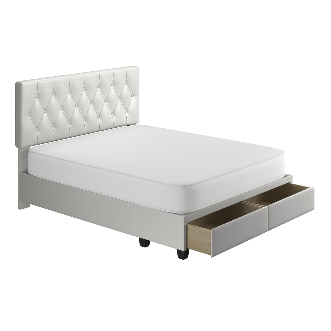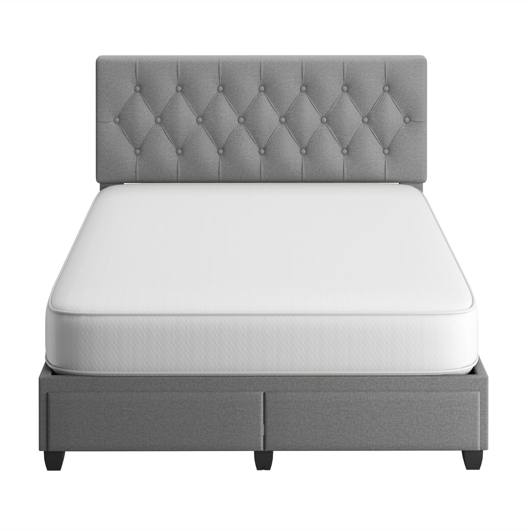 The Salerno-Verona platform storage bed combines tufted upholstered style with convenient double drawers at the foot of the bed. The solid storage drawer section comes pre-assembled and works with the 8 cross slats for durable support.
