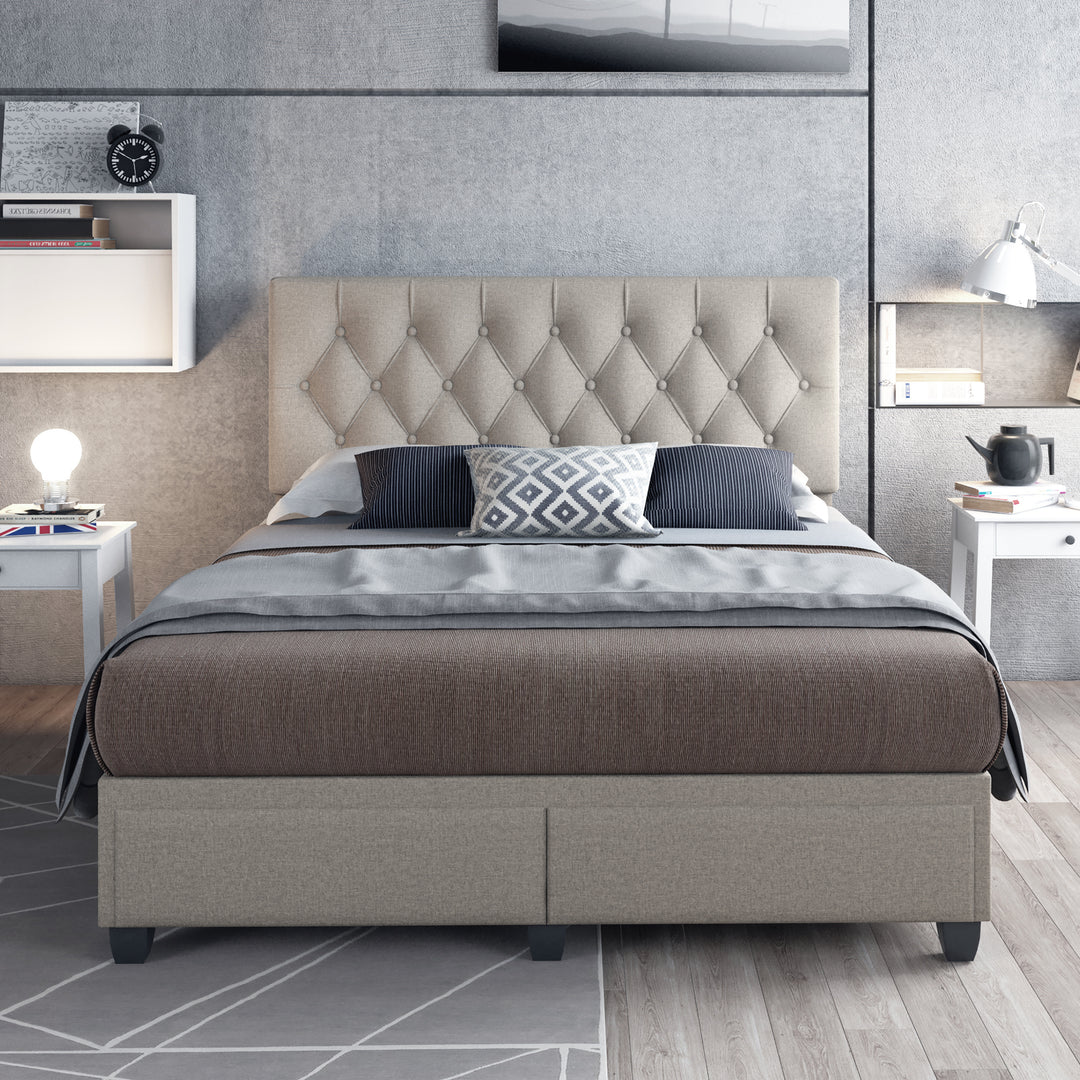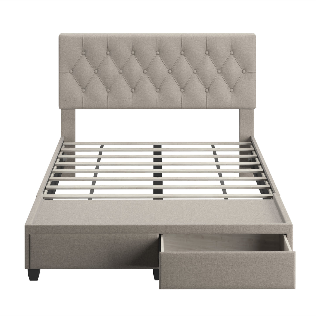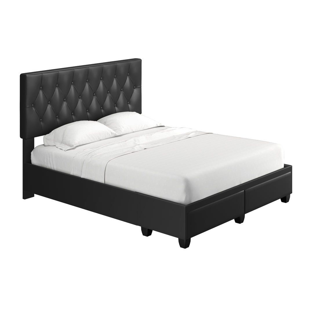 The Salerno-Verona platform storage bed combines tufted upholstered style with convenient double drawers at the foot of the bed. The solid storage drawer section comes pre-assembled and works with the 8 cross slats for durable support.