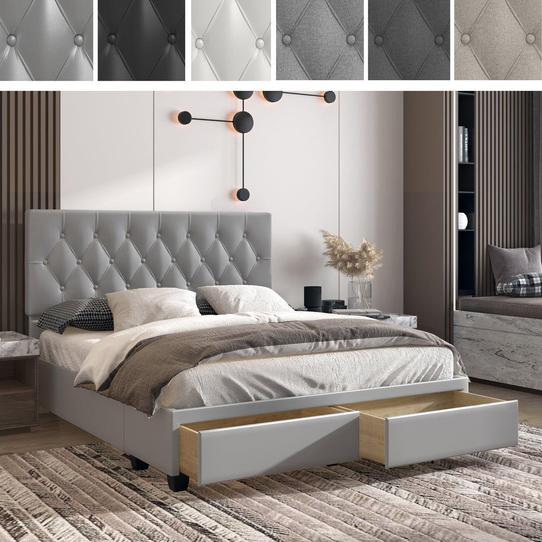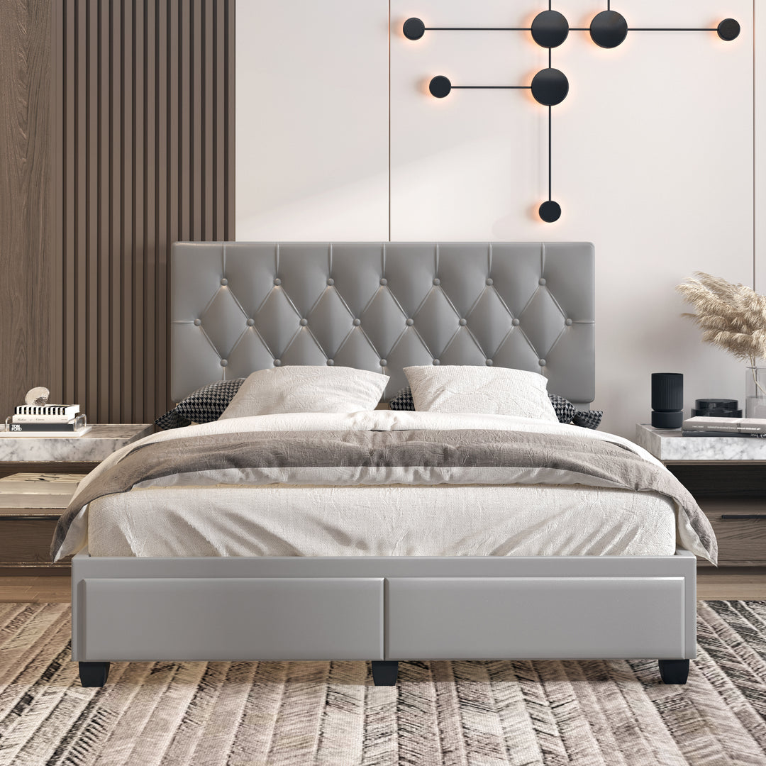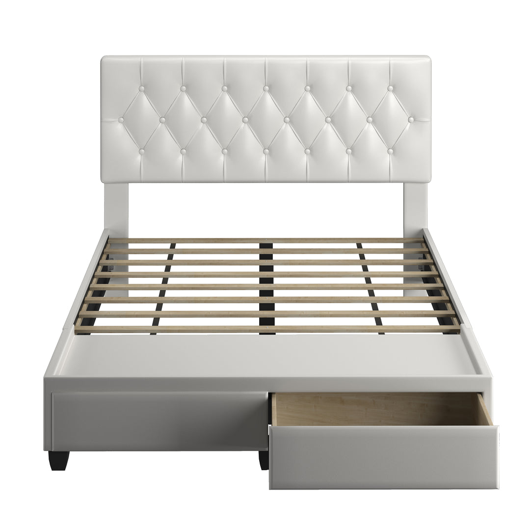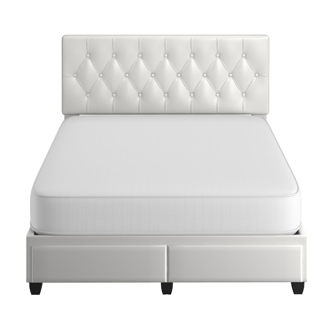 The Salerno-Verona platform storage bed combines tufted upholstered style with convenient double drawers at the foot of the bed. The solid storage drawer section comes pre-assembled and works with the 8 cross slats for durable support.