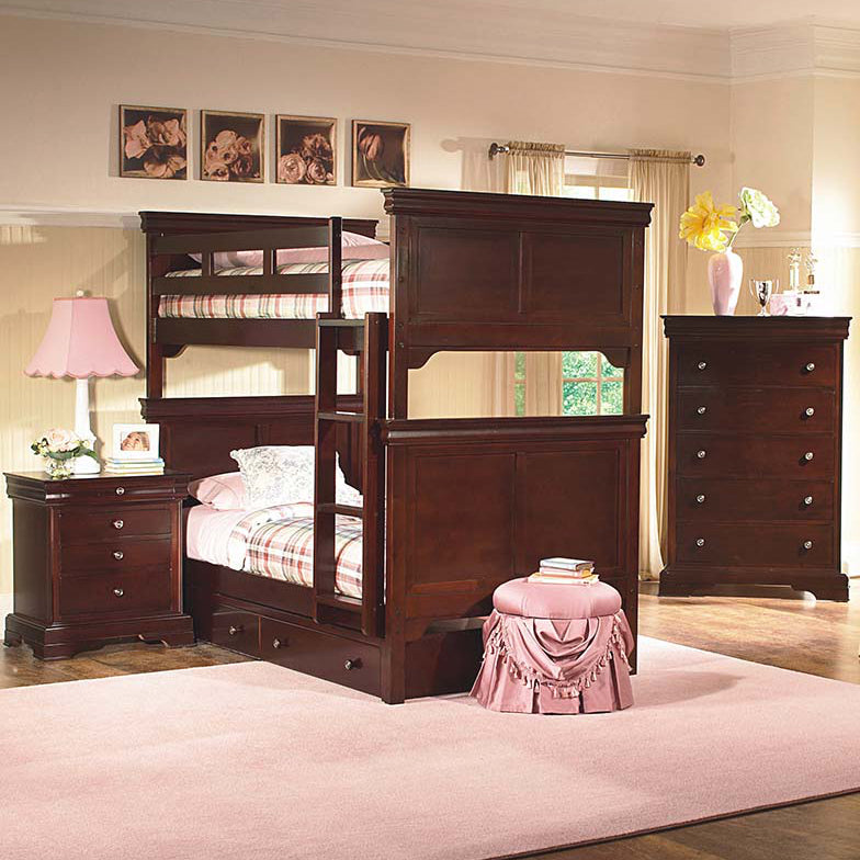 The Versailles bed features traditional style with Louis Philippe inspired treatments. Details in this collection include soft curves, a rich Bordeaux finish, full return crown moldings and bracket foot base.
